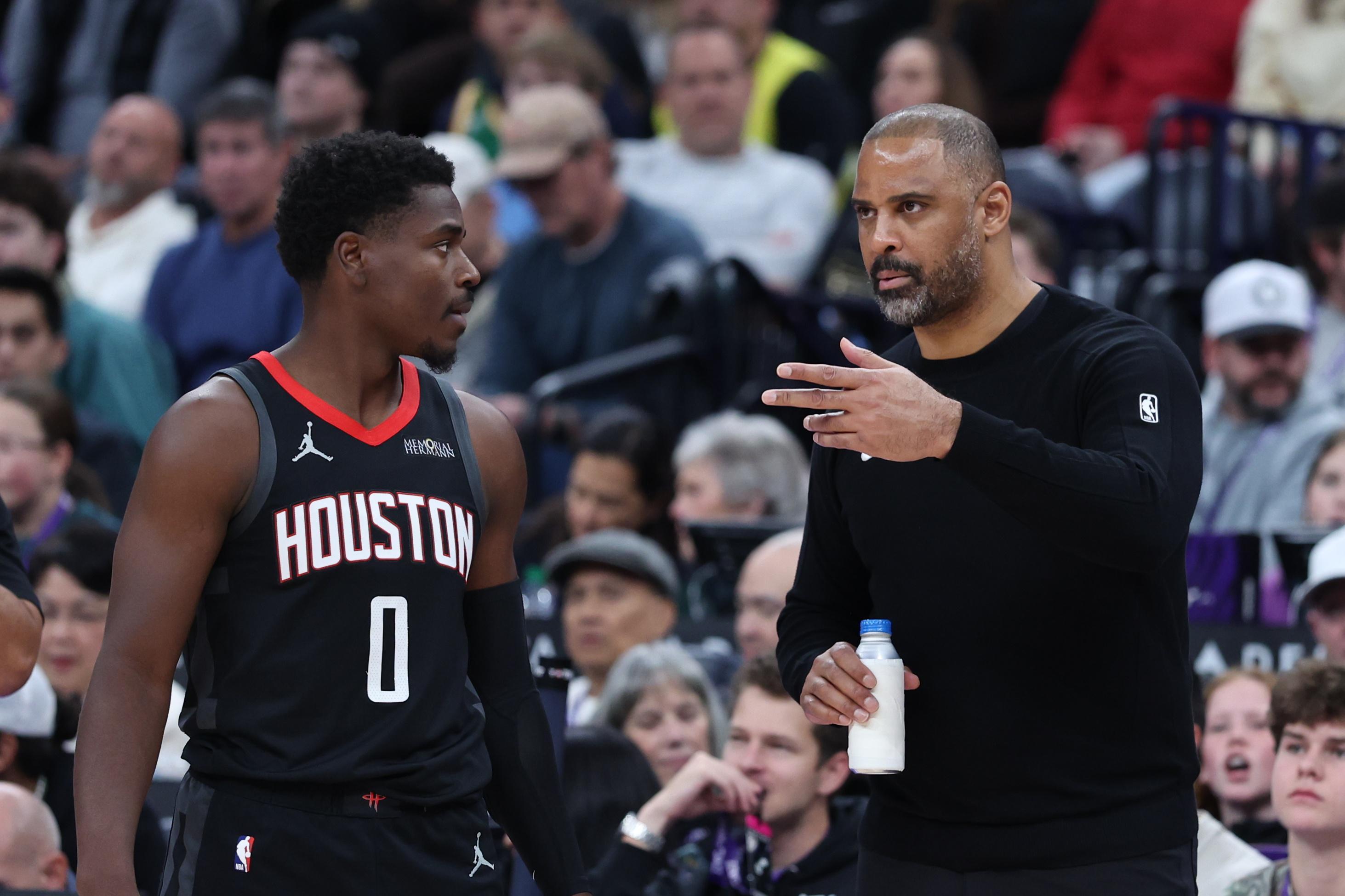 乌度卡在阵容配置上不断做尝试,其中在首个替补衔接段用霍勒迪+谢泼德+申京+亚当斯+阿门的双矮+双塔阵容,到第二节干脆又摆出五大阵容,亚当斯+申京+史密斯+杜兰特+阿门,这些阵容在攻防两端效果都没有特别明显。