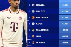 2024-25赛季各俱乐部阵容身价跌幅榜: