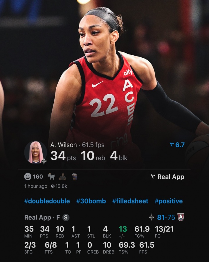 球队核心阿贾-威尔逊全场出战35分钟,21投13中,三分3中2,罚球8罚6中,狂砍34分9篮板1助攻1抢断4盖帽的全能数据,正负值达到+13。